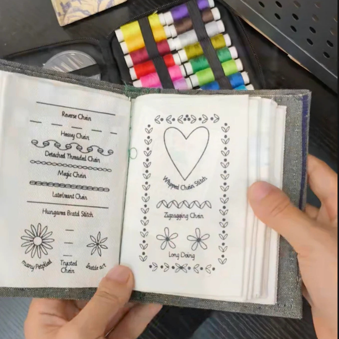 The kit includes a creative book with over 60 embroidery patterns, 18 colorful thread spools, 15 sewing needles, 1 pair of sewing scissors, 15 paper clips, sewing buttons, 1 sewing pen, and a detailed user guide explaining how to use each item.